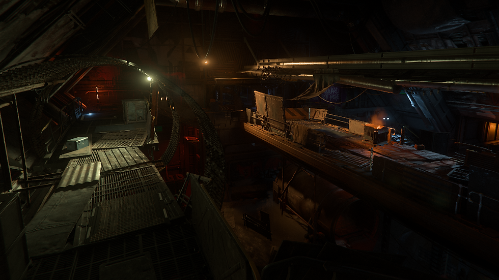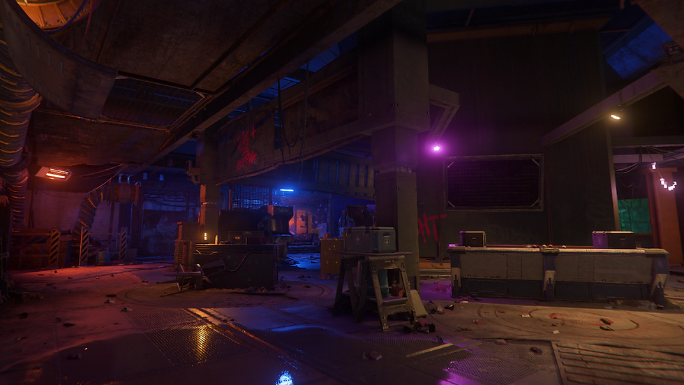 Orbituary Station features a more traditional, PvE focused dungeon experience. I was responsible for the layout and AI implementation of its Reward Room. The room takes the form of an old hangar that has been repurposed into a form of guarded warehouse by the Xenothreat Gang. Various makeshift guard structures, containers and hangout spots make up the cover and navigation of the space. It is designed and balanced around combat only, with three loosely defined "lanes" that players can choose from to tackle the room their preferred way. This area contains high-tier guns, ship components and, hidden in a back room, one of the Databoard Printers.