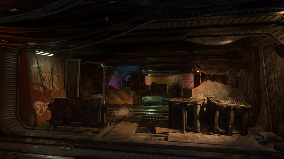 Contested Zones were a late addition to the Pyro star system. Done over the course of five months, they were born out of the "Abandoned Sections" of the Pyro Reststop Stations, which were seen during the 2023 CitCon demo. These were meant to be a sort of "wilderness" where players could take on missions like creature eliminations and missing person cases but were deemed too uninteresting, mazelike and samey and were therefore exchanged for the Contested Zones. Because of the tight development span, most of the locales that we used were repurposed cut content.